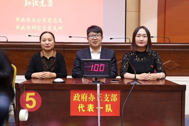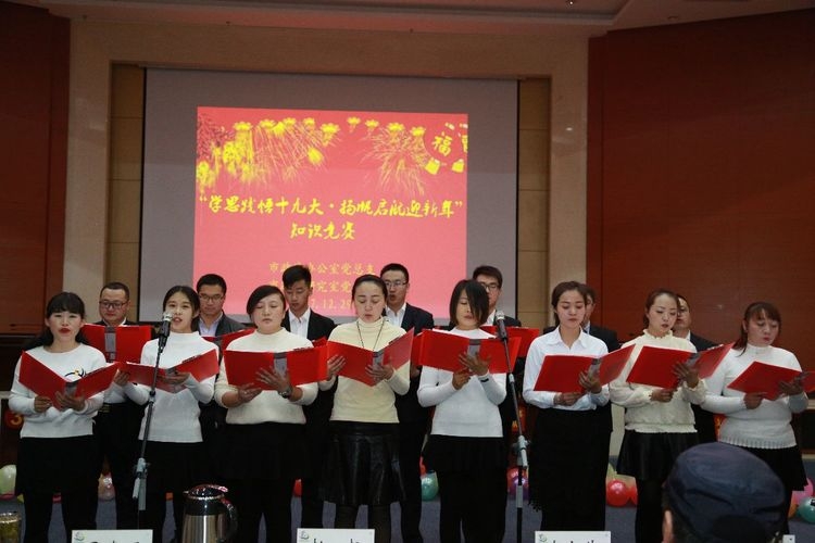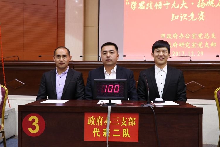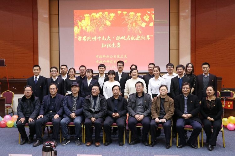 为深入推进“两学一做”学习教育常态化制度化,确保党的十九大精神及十九大修改后的《党章》在全体干部职工中入脑入心入行,在2018年新年来临之际,市政府办公室党总支部与市政府研究室党支部联合,于2017年12月29日组织开展了“学思践悟十九大?扬帆启航迎新年”主题知识竞赛。